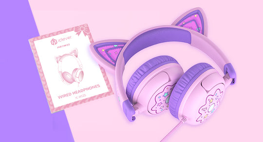 an iClever Meow Lollipop headphone and a user manual. Ideal gift choice for